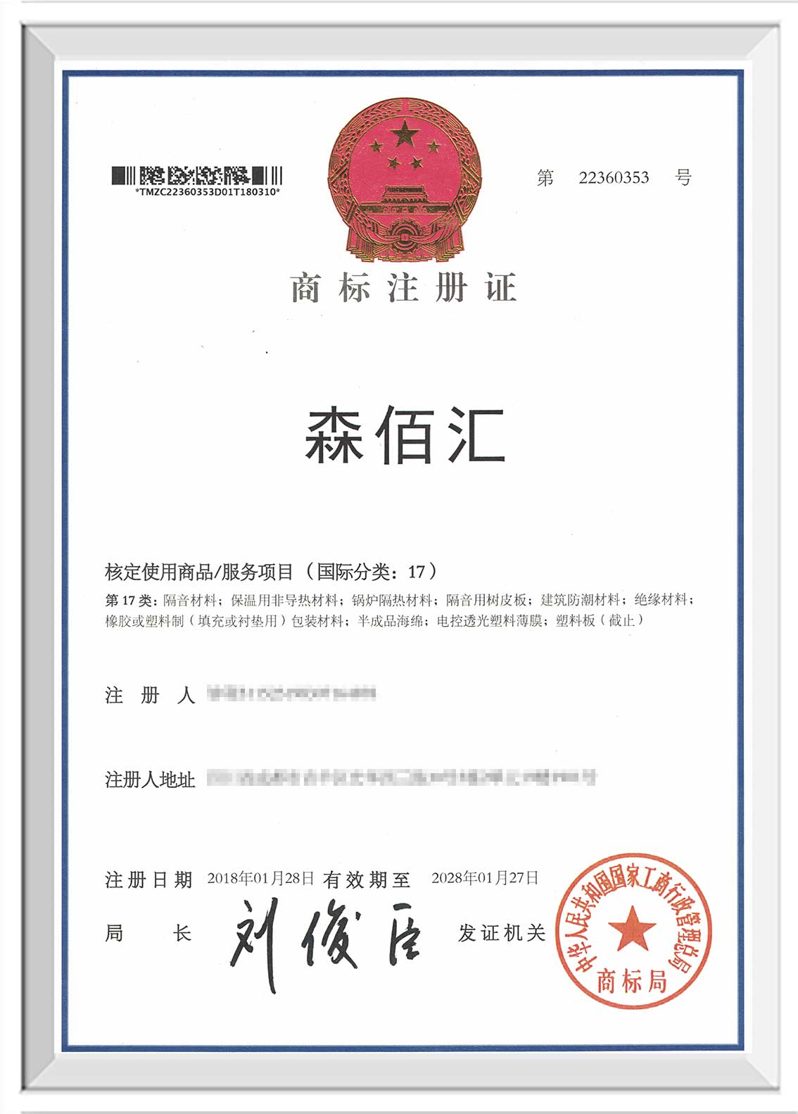 萍乡“森佰汇”商标证书下发至企业
